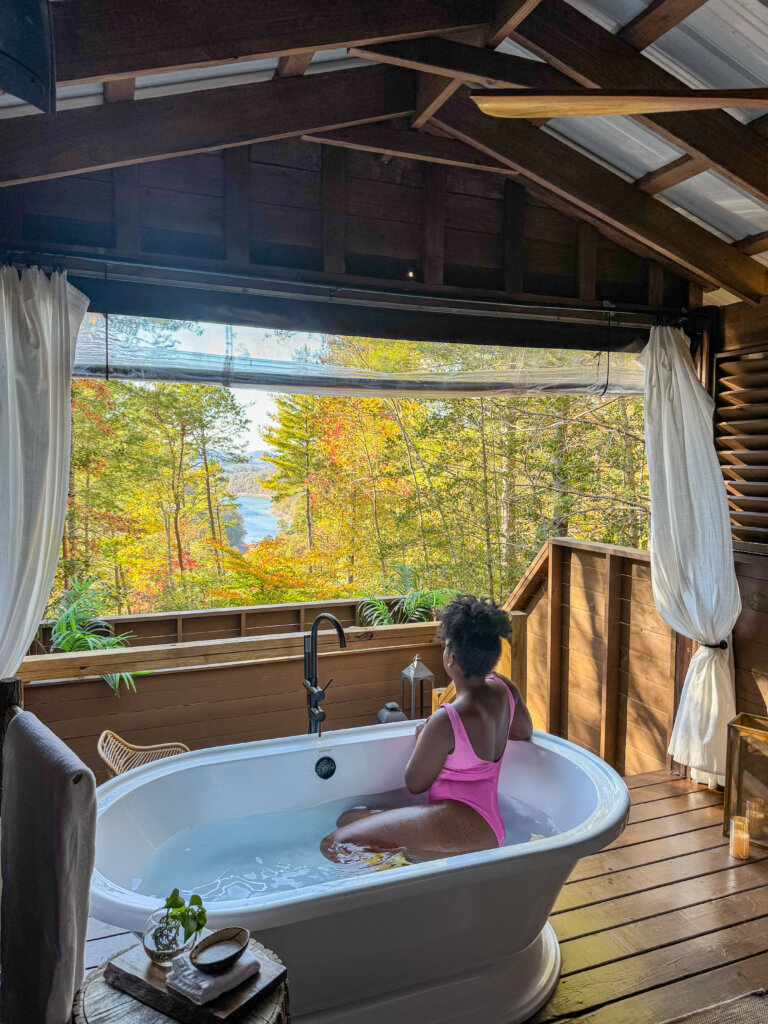 I didn’t even know this was a thing in Bryson City, but now it’s one of my favorite finds. At Lakeview at Fontana, you can book a private treetop soaking cabana; basically a warm outdoor bath with forest views, ambient lights, and total quiet.