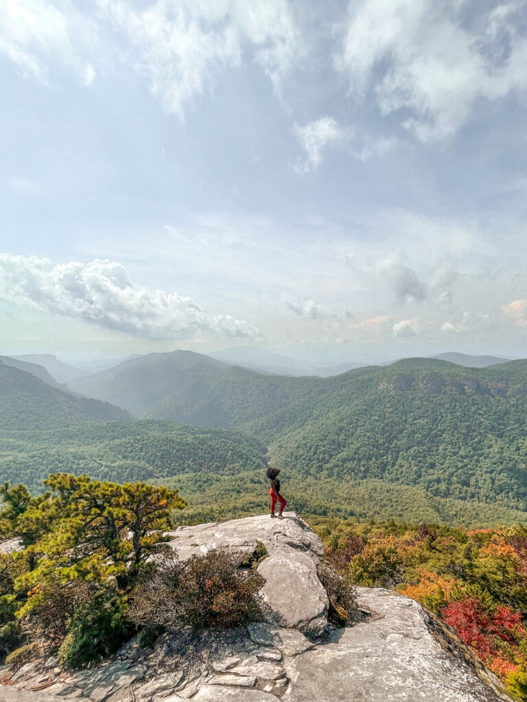 It’s a consistent climb, with a few steeper switchbacks toward the top, but nothing too technical. Once you reach the summit, you’re met with an open granite face and sweeping views of the surrounding Blue Ridge Mountains. And for fall colors in North Carolina?! It’s absolutely stunning to see all the trees painted the perfect shades of red, orange, and yellow!