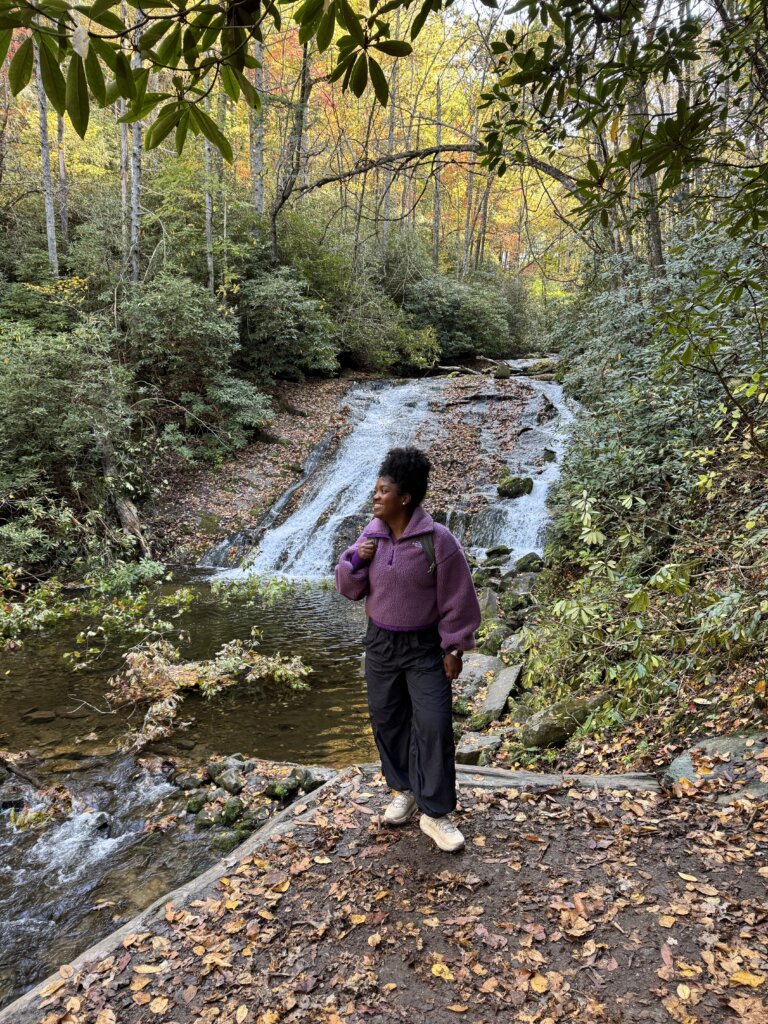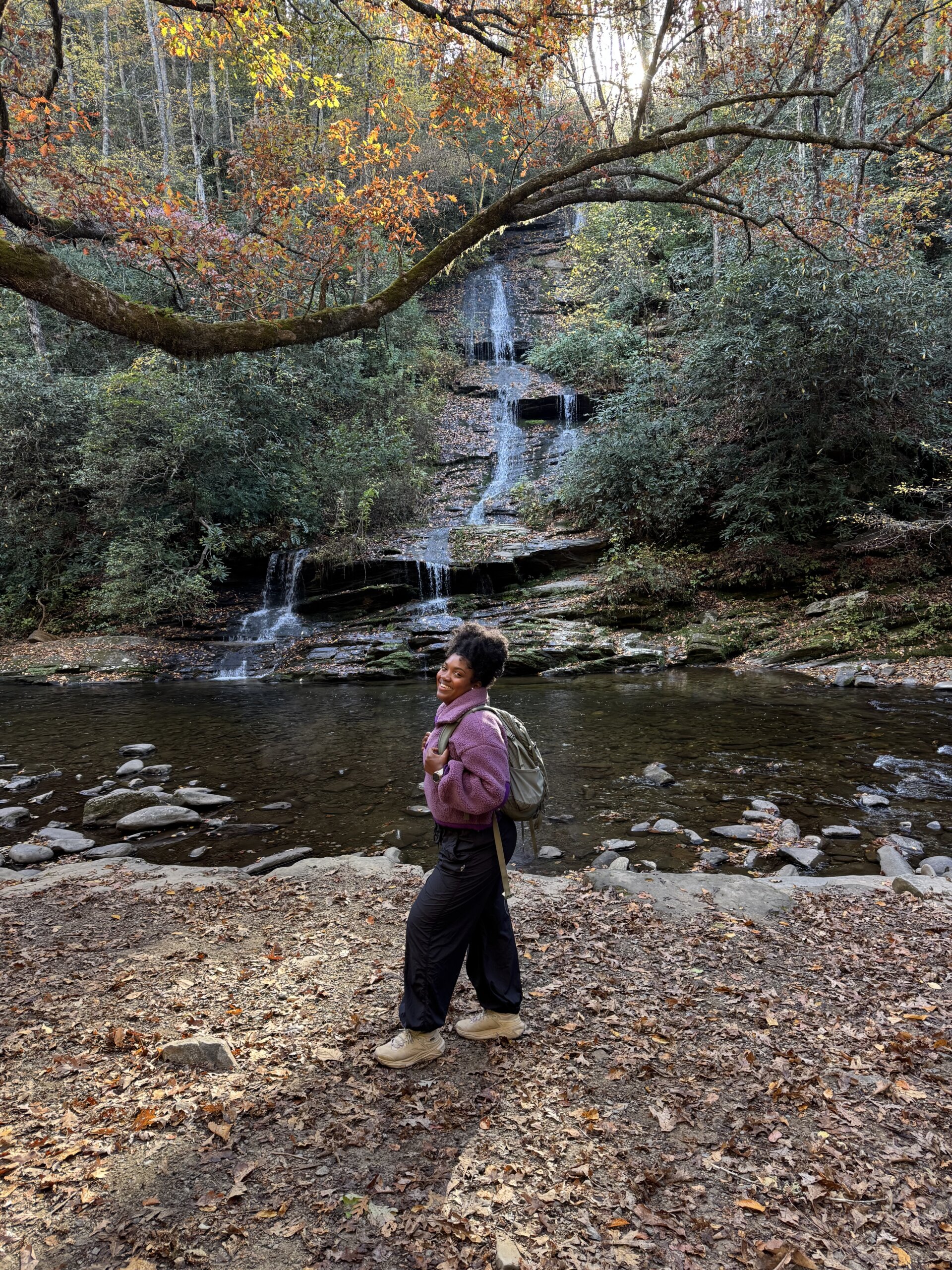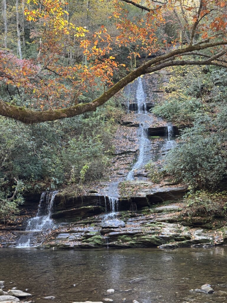 The waterfall sits about two miles in and drops roughly 45 feet into a calm, clear pool. The overlook gives you a clear view without needing to scramble over rocks, and there’s plenty of space to sit, rest, or just listen to the creek for a moment before heading back.