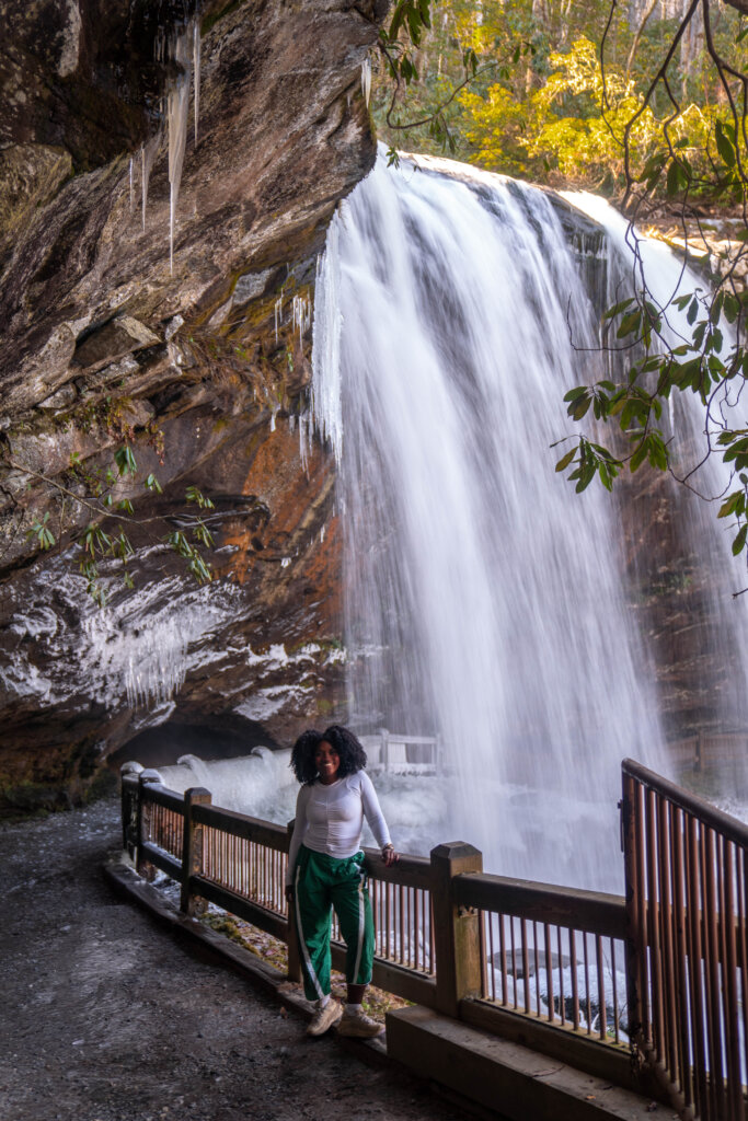 Dry Falls is one of the most popular Highlands NC waterfalls, and it’s easy to see why. Located just a few minutes from downtown Highlands along US-64, this waterfall is incredibly easy to access and doesn’t require a hike. A short, paved walkway leads down to the base, where you can walk behind the waterfall and stand underneath a rock overhang as the water flows overhead